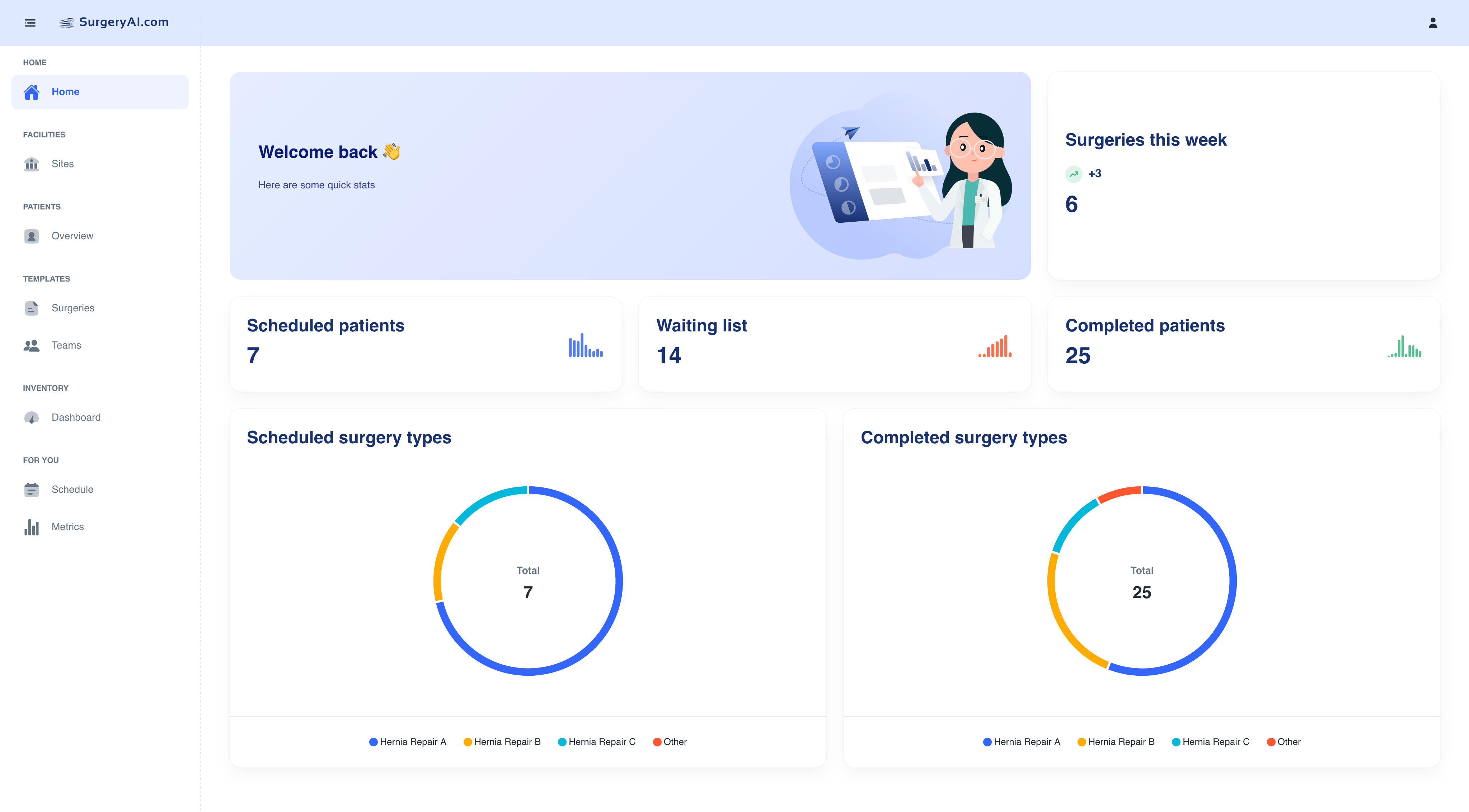 Our smart scheduling solution is ideal for healthcare providers managing a high volume of non-emergency surgeries and other medical appointments, or those who perform high-complexity procedures which vary in length considerably based on specific circumstances of each patient. Additionally, SurgeryAI can help streamline inventory management and monitoring, including tools and equipment.